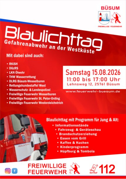 Büsum – Am Samstag, den 15. August 2026, lädt die Freiwillige Feuerwehr Büsum zum großen Blaulichttag unter dem Motto „Gefahrenabwehr an der Westküste“ ein. In der Zeit von 11:00 bis 17:00 Uhr erwartet Besucherinnen und Besucher auf dem Gelände am Lehnsweg ein abwechslungsreiches Programm für die ganze Familie.