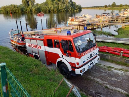 Mehrzweckboot der Wehr am Hafen mit Hilfe von unterschiedlichen Drehleitern in